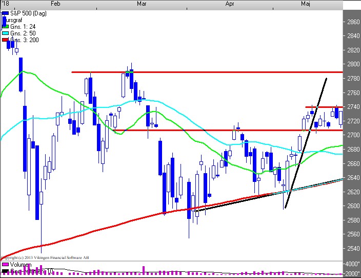 BørsUdsigten forventer derfor, at der vil ske et udbrud af S&P500’s base gennem toplinien i 2.738 niveauet – og efterfølgende stigning mod 2.790-800 niveauet. Forventning er et noget andet chartet, der endnu ikke har givet signal, og BørsUdsigten handler på signalerne på chartet – men derfor kan man godt være parat.