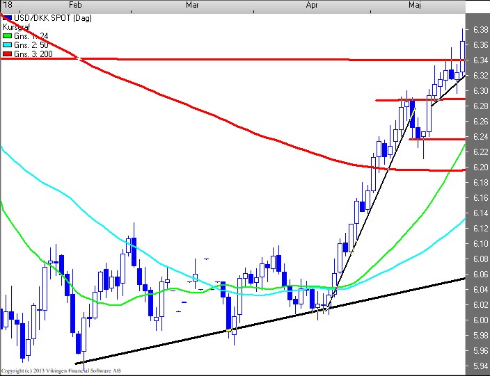 Ser BørsUdsigten på dagschartet for valutakrydset USD/DKK (6,36), fik vi igen et købesignal ved bruddet af 6,34 niveauet. Nyt kursobjektiv i 6,43 niveauet, eventuelt efter en test af den gamle modstand, nu støtte, i 6,34 niveauet.