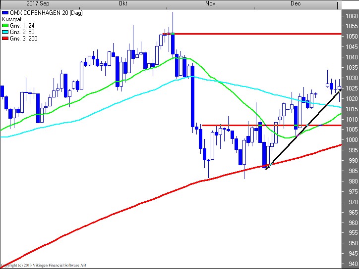 Ser BørsUdsigten på dagschartet for C20 (1.026), ligger vi fortsat i en stigende trendkanal, efter udbruddet i 1.007 niveauet. Der er fortsat tale om spekulativt ”buy the dip” / køb på trendlinien i 1.024 niveauet; men vær klar til en reverse (vende positionen). BørsUdsigten vurderer, at der er gode chancer for en test af 1.035-40 niveauet – dog ikke som spået – inden nytår.