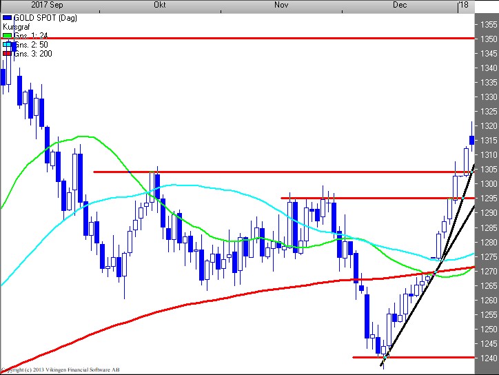 Ser BørsUdsigten på dagschartet for guld (1.315), fortsætter den accelererende prisudvikling (trend) ud over vores konsolideringsniveau i 1.295-305 niveauet. Guld er nu stærkt overkøbt, og vi må forvente en opbremsning – men indtil der stoppes ud må man ”ride bølgen”. Næste konsolideringsniveau i 1.345-55 niveauet.