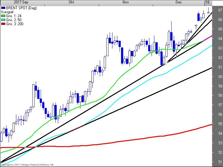 Ser BørsUdsigten på dagschartet for UK Brentkvaliteten (66,8), ligger vi fortsat i en accelererende optrend både sekundært som tertiært. Spekulativt udløses et salgssignal ved brud af 66 niveauet.