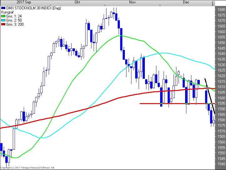 Ser BørsUdsigten på S30 indekset 1.580 (plus 0,2 pct. (2,88 point), er der tale om en bekræftet accelererende nedtrend efter et kraftigt udbrud fra en base med en støtte i 1.595 niveauet. Bundlinien er testet flere gange hvilket forstærker salgssignalet. Udbruddet skal følges. BørsUdsigten har haft en udbrudsstrategi.