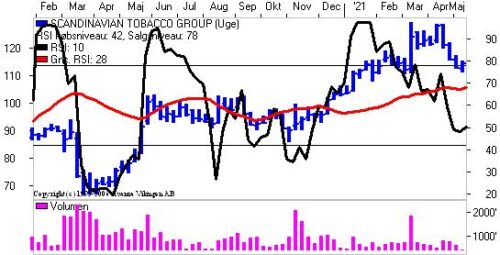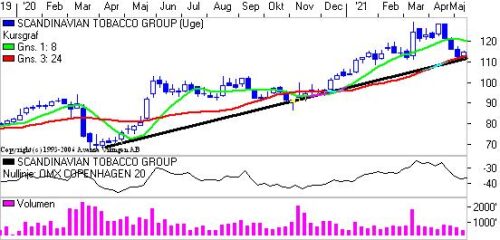 Scandinavian Tobacco Group-aktien etablerede en top i marts i niveauet 129 og herefter i begyndelsen af april blev der ligeledes etableret en top i samme niveau, hvilket har sendt aktiekursen ned til støtteniveauet 112, som blev testet i begyndelsen af marts.