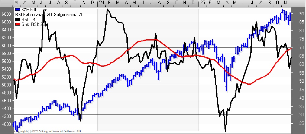 Der er divergens mellem de tre indikationsmodeller på ugebasis. Momentum fortsætter den faldende tendens, mens RSI har taget en rebound og nu er stigende og har ramt 64. MACD er ligeledes i en stigende tendens, men fortsat over middelværdien 0 på ugebasis.