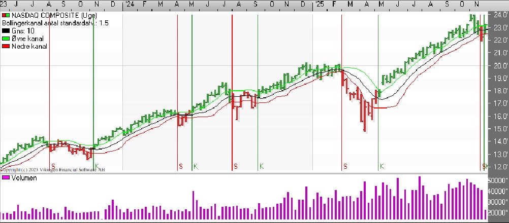 Nasdaq Composite viser samme signal på dagsniveau som S&P 500. På ugebasis er kursgrafen fortsat i salg, og Bollingerkanalen har netop etableret et nyt købssignal i denne uge.