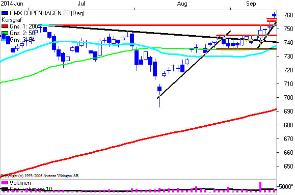 BørsUdsigten har købte ved bruddet af den faldende trendlinie i 743 niveauet. Der hjemtages trendfølgende gevinst ved brud af den stigende tertiære trend i 755 niveauet.