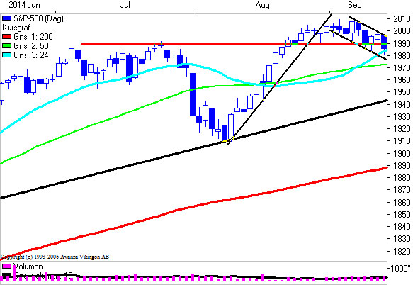 Ser BørsUdsigten på dagschartet for S&P500 (1.986), ligger vi nu i en faldende trendkanal. Der er tale om en tertiær positiv fortsættelsesformation. Der udløses køb ved brud af 1.997 niveauet.