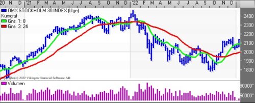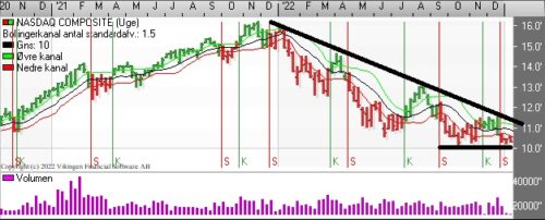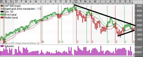 På ugebasis er der købssignal i Bollingerkanalen på ugebasis. Den nedre støttelinie i Bollingerkanalen ligger i niveauet 2050 og bliver den brudt, skifter modellen til salg. De glidende gennemsnit på ugebasis etablerede et Golden Cross i slutningen af november.