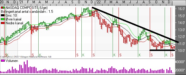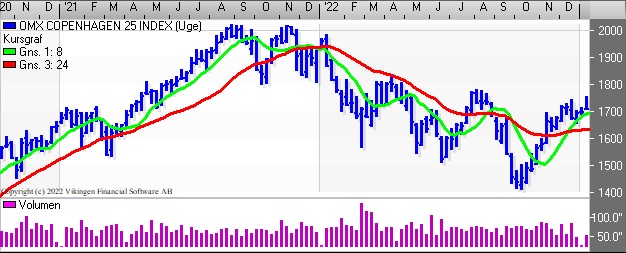 På ugebasis er der etableret købssignal i slutningen af oktober i Bollingerkanalen og de glidende gennemsnit på 8 og 24 uger har etableret et købssignal i slutningen af november.