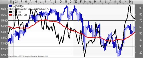 Den stigende tendens trækker op i de tre indikationsmodeller. RSI er over 80. MACD er over 0. Momentum er i en stigende tendens efter der blev etableret en bund i midten af november.