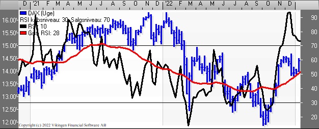 Der er en faldende tendens i de tre indikationsmodeller på ugebasis. RSI er under 38 og MACD er under middelværdien 0. Momentum har ligeledes etableret en topformation og er nu i en faldende tendens.