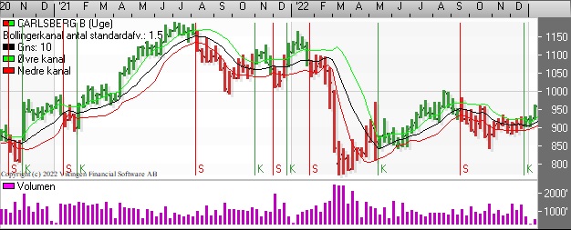 Carlsberg etablerede et nyt købssignal i Bollingerkanalen i begyndelsen af december på dagsniveauet. De glidende gennemsnit på 8 og 24 dage etablerede et Golden Cross i midten af december.