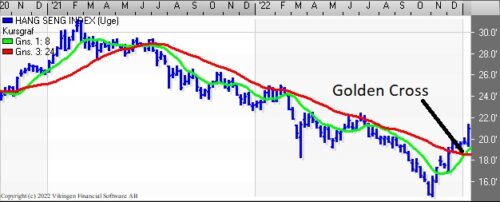 Hang Sang fortsætter op og købssignalet er bekræftet som vi skrev om den 16/12 i Trends. RSI er over 80 på ugebasis så der må forventes en afmatning i den stigende tendens. Nærmeste modstandsniveau er ved 22.000.