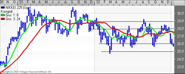 Det japanske marked er faldet tilbage under 26.000 som også var tilfældet i oktober og ved månedsskiftet juni/juli. Dengang var det en opsamlingsmulighed i niveauet 25.500-26.000. Der er salgssignal på både dags- og ugeniveauet.