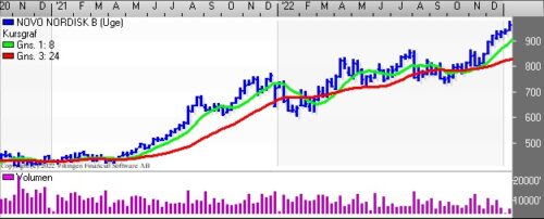 Den positive tendens trækker op i de tre indikationsmodeller på ugebasis. RSI er over 80. MACD er over middelværdien 0. Momentum er ved at etablere en topformation. Nærmeste støtteniveau er ved 940 og herefter i niveauet 910, mens der er modstand i niveauet 1050 og herefter i niveauet 1120. Brug tilbagefald i aktiekursen til opsamling.