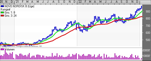 Novo Nordisk holder fast i den stigende tendens. På dagsniveauet er der købssignal i både Bollingerkanalen og de glidende gennemsnit har etableret et nyt Golden Cross i midten af november.
