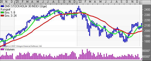 OMX Stockholm 30 holder fast i købssignalet i Bollingerkanalen som blev etableret ved årsskiftet på dagsniveauet. De glidende gennemsnit på 8 og 24 dage er tæt på at etablere et Golden Cross på dagsniveauet.