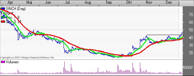 Sinch har testet kursniveauet 42 i november og december og her i januar brød kursen igennem og nu handles aktien i niveauet 45,75. På dagsniveauet er der etableret købssignal i Bollingerkanalen i slutningen af december. De glidende gennemsnit på 8 og 24 dage har etableret et Golden Cross i midten af december.