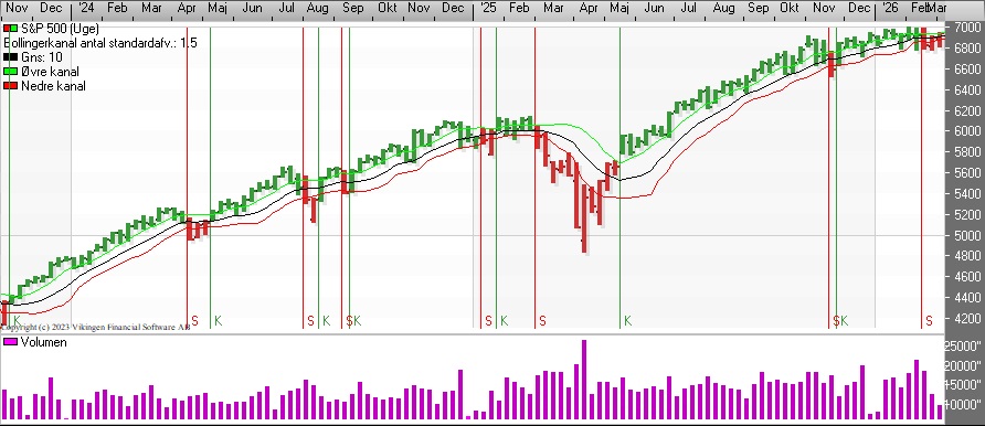 S&P 500 har på dagsniveau etableret et salgssignal i begyndelsen af februar. Bollingerkanalen har dog etableret et nyt købssignal i denne uge på dagsniveau. Den nedre støttelinje er i niveauet 6.830 og skal brydes, før signalet ændres til salg.