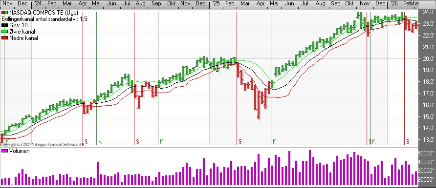 Nasdaq Composite har forskellige signaler på dagsniveau. I kursgrafen er der salgssignal, mens der er købssignal i Bollingerkanalen, og det har stået på i to dage.