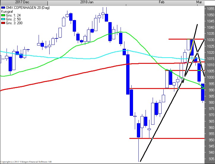 Ser BørsUdsigten på dagschartet for C20 (981), ligger vi i en stærk nedtrend. Opbremsning og spekulativt købesignal ved brud af 1.000 niveauet. EXIT og bekræftelse af ”Fools Rally”.