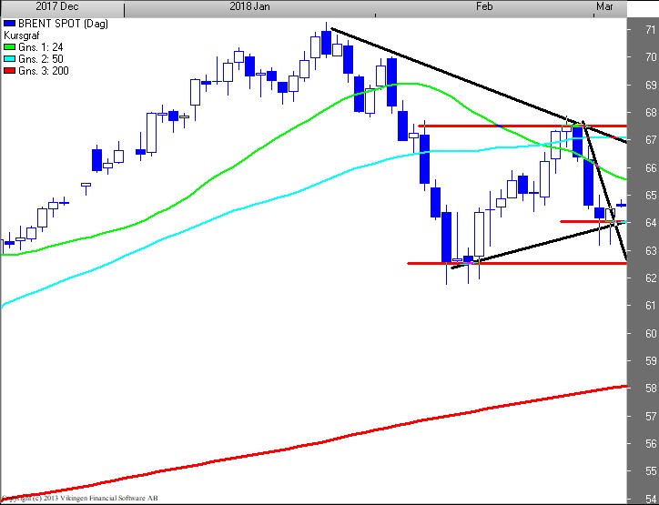 Ser BørsUdsigten på dagschartet for UK Brentkvaliteten (64,6), har 64 niveauet dannet spekulativ bund, og en ubekræftet optrend. Sekundært er der tale om en kileformation. Brydes den sekundære støtte i 62,5 niveauet, er der tale om en sekundær bekræftet nedtrend.