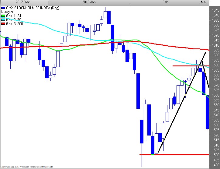 Ser BørsUdsigten på S30 indekset 1.526 (minus 2,2 pct. (34,10 point), fik vi onsdag et tertiært salssignal ved bruddet af 1.585 niveauet, og det blev bekræftet ved gårsdagens, lukning i 1.561 niveauet. Det betyder mindst en opbremsning i den stigende trend. Fredag blev den negative trend bekræftet.