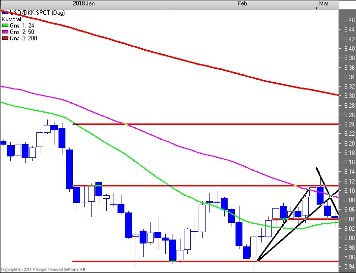 Ser BørsUdsigten på dagschartet for valutakrydset USD/DKK (6,046), ligger vi i en tertiær nedtrend.