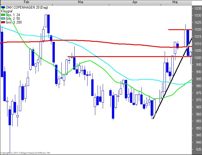 Ser BørsUdsigten på dagschartet for C20 (1.004), er der fortsat tale om en optrend. Salgssignal udløses bekræftet ved brud af 1.000 niveauet.