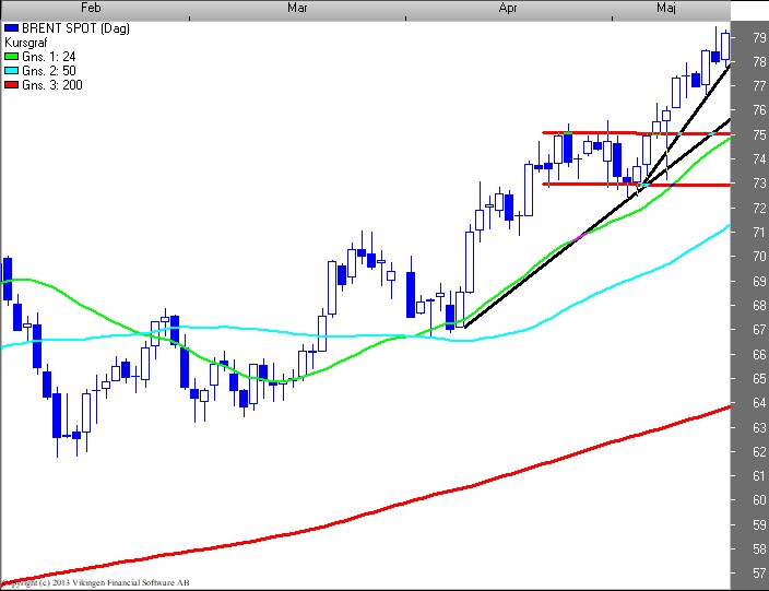 Ser BørsUdsigten på dagschartet for UK Brentkvaliteten (79,4), ligger vi fortsat i en accelererende tertiær optrend. Brud af 78 niveauet udløser tertiært salgssignal. Brud af 76 niveauet udløser sekundært salgssignal.