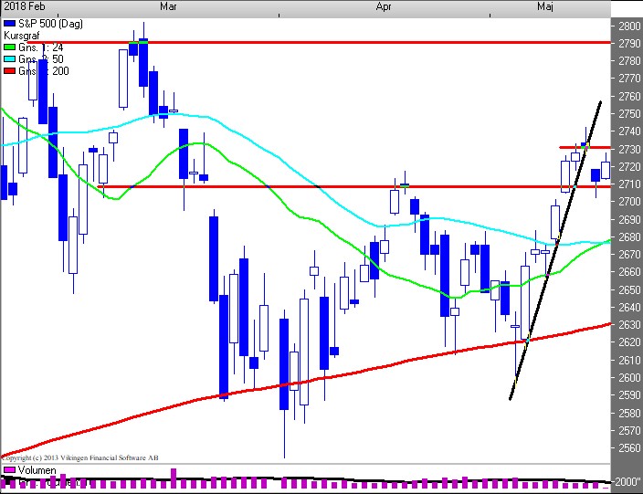 Ser BørsUdsigten på dagschartet for S&P500 (2.722), er der tale om en spekulativ/tertiær konsolidering. Brud af 2.730 udløser købesignal, og brud af 2.710 udløser salgssignal. BørsUdsigten vurderer, at et brud gennem 2730 niveauet er det mest sandsynlige (genoptagelse af optrenden), og dermed en test af 2.790 niveauet. Det er fortsat renten og den dermed affødte stigning i USD, der lægger en dæmper på festlighederne.