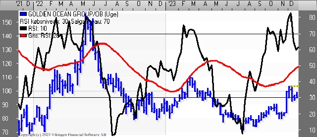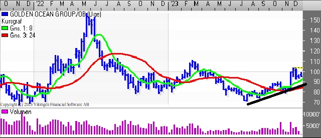 Den anden shipping-aktie Golden Ocean Group er i den nordiske portefølje. De glidende gennemsnit på 8 og 24 dage etablerede et Golden Cross i slutningen af november. Bollingerkanalen på dagsniveauet etablerede nyt købssignal mandag.