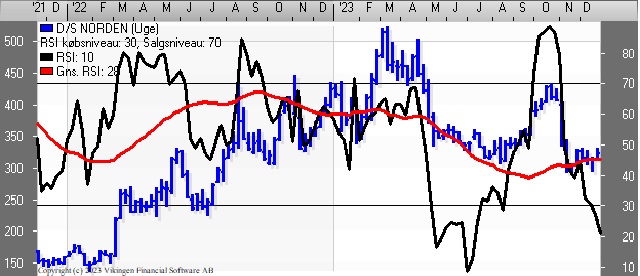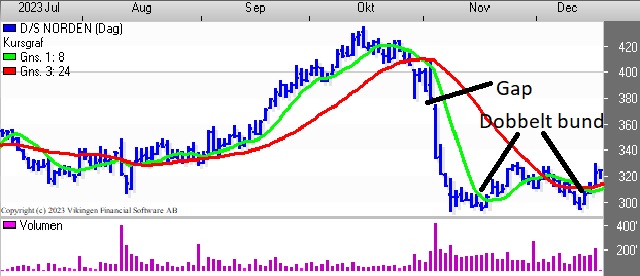 Der er etableret en dobbelt bund på dagsniveauet med støtte i niveauet 295-300. Den første bund var i midten af november og anden bund blev etableret for 3 dage siden.