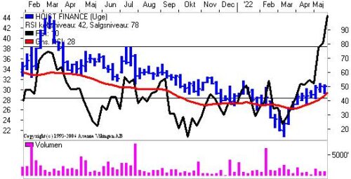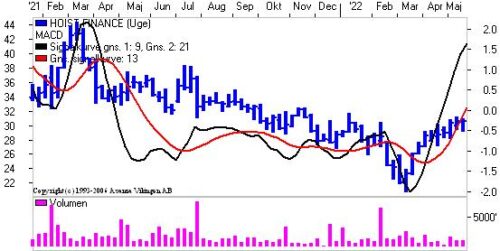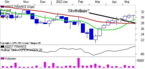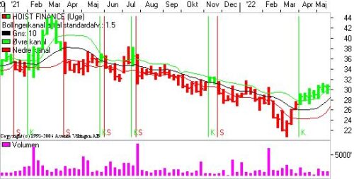 I denne analyse ser vi på Hoist Finance. Aktiekursen toppede i 2018 i niveauet 95-96 og nu handles aktien i niveauet 30-31. I maj var 2020 var aktiekursen i 18 og i marts 2022 blev niveauet 22 testet. Omsætningen og bundlinie har været faldende siden 2018, hvilket har været med til at trække aktiekursen ned. Siden marts har aktiekursen været i en stigende tendens og dengang blev den handlet i niveauet 21-22 og i dag handles aktien i niveauet 30-31.