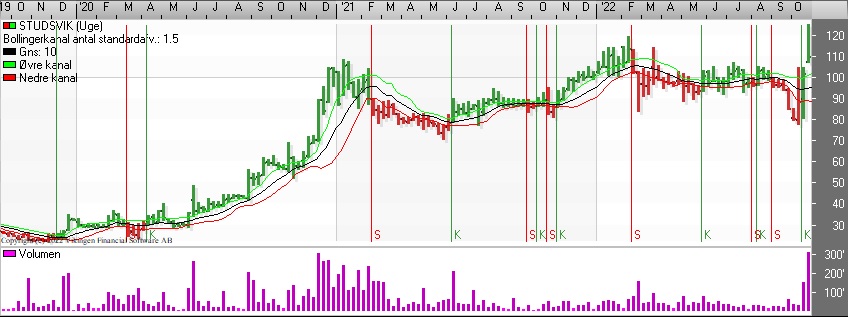 Der er købssignal i Bollingerkanalen på ugebasis, mens der endnu ikke er etableret købssignal i de glidende gennemsnit, da det lange glidende gennemsnit på 24 uger stadig ligger over det korte glidende gennemsnit på 8 uger. Kursudviklingen er brudt igennem de glidende gennemsnit nedefra.