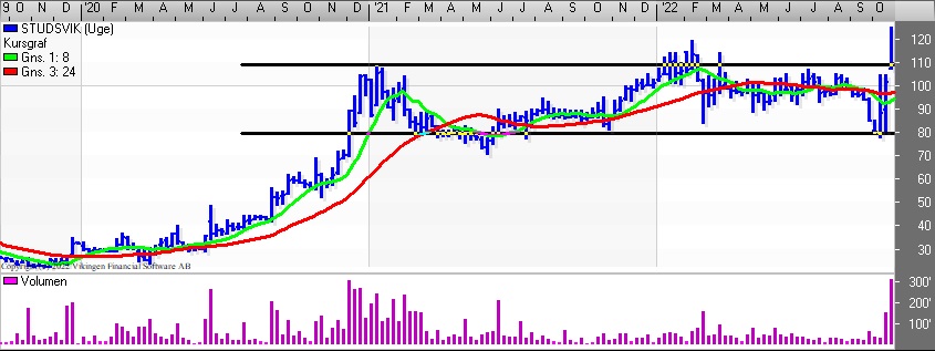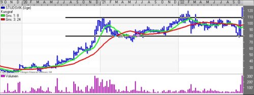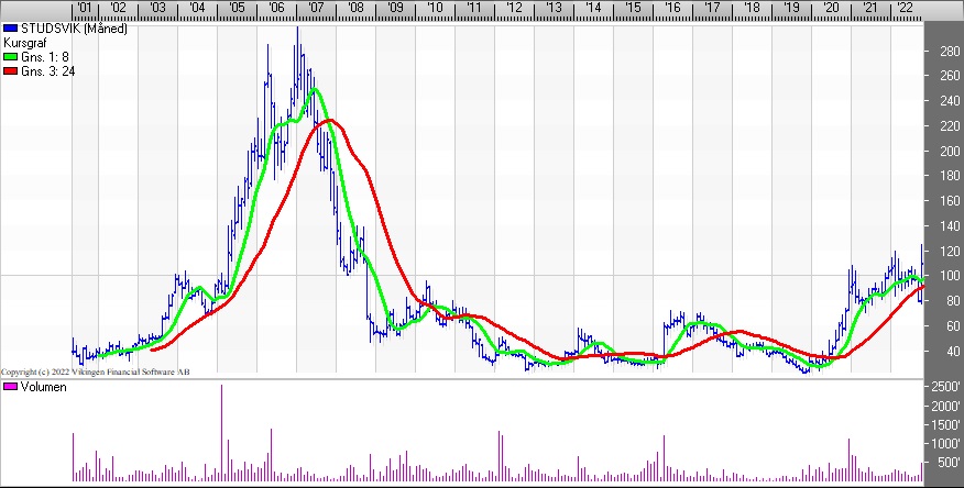 Aktien har ellers bevæget sig vandret i niveauet 80-110 siden november/december 2020. Den stigende tendens betyder, at modstandsniveauet er blevet brudt og man skal tilbage til 2008 for at finde kursen i det niveau. Aktien toppede tilbage i 2006/2007 i niveauet 280.