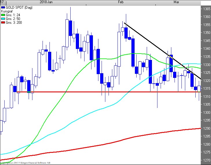 Ser BørsUdsigten på dagschartet for guld (1.318), er der igen tale om et kraftigt angreb på bundlinien i 1.315/1.310 niveauet.