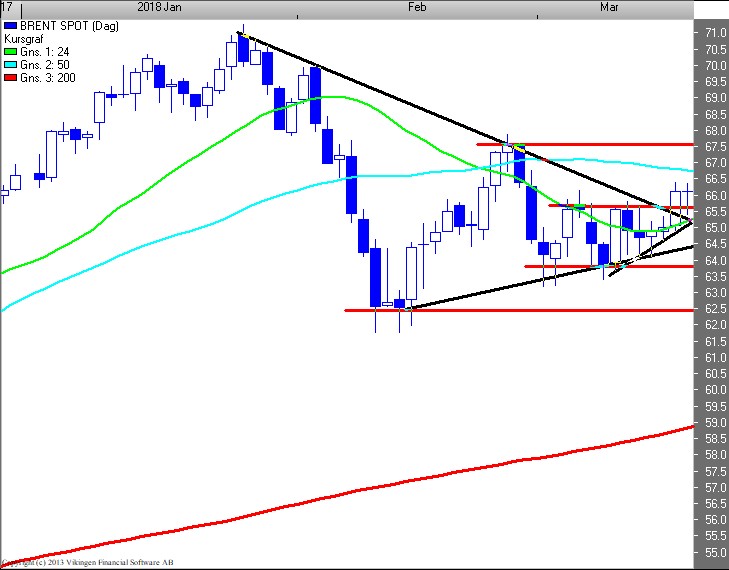 Ser BørsUdsigten på dagschartet for UK Brentkvaliteten (66,1), er der tale om et udbrud af den tertiære sidelæns konsolidering i 65,75 niveauet. Tertiært er der udløst et spekulativt købssignal ved bruddet af 64,25 niveauet. Det ligner et angreb på toplinien i 67,5 niveauet.