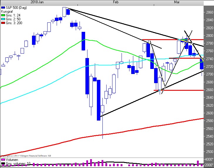 Ser BørsUdsigten på dagschartet for S&P500 (2.713), ligger vi i en sidelæns konsolidering med en toplinie i 2.790 niveauet og en bundlinie i 2.660 niveauet. Sekundært har vi en kileformation med en stigende sekundær trendlinie p.t. i 2.710 niveauet, og en faldende i 2.770 niveauet. (Testes NU). Brud udløser salgssignal, men vi skal have et brud af 2.660 niveauet før vi får en trendændring. Da vi er forholdsvis langt ude i kilen forventes der ikke nogen særlig stærk bevægelse ved et udbrud.