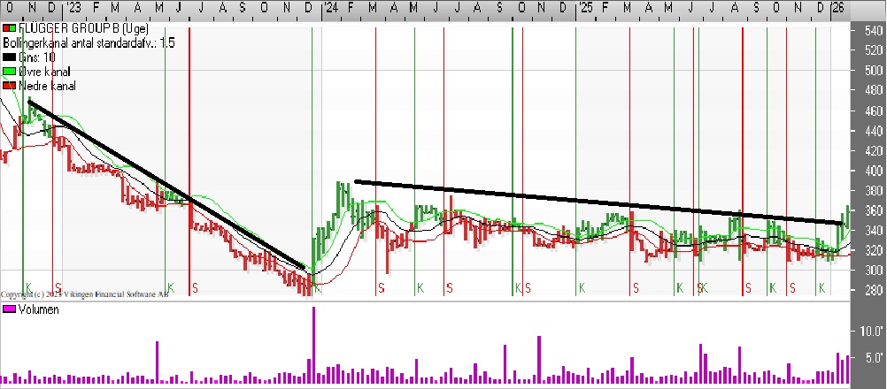 Flügger Group har etableret et købssignal i kursgrafen i begyndelsen af januar. Det samme signal ses i Bollingerkanalen på dagsniveau. På ugebasis er der ligeledes købssignal i både Bollingerkanalen og kursgrafen.