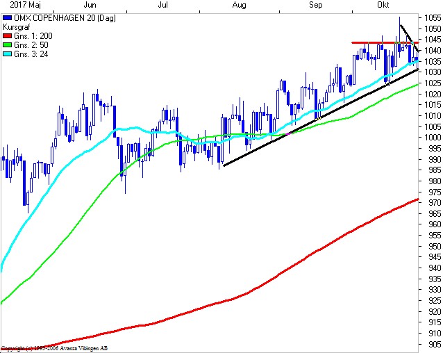 Ser BørsUdsigten på dagschartet for C20 (1.039), holder det spekulative / tertiære salgssignal fortsat. Sekundært er der tale om en kileformation, hvor brud af 1.040 vil udløse spekulativt købesignal, brud af 1.044 sekundært købesignal. Brud af den stigende trendlinie i 1.030 udløser salgssignal.