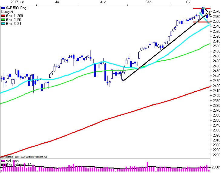 BørsUdsigten’s forventning om en midlertidig top (mandag) ser ud til at holde. Nu må vi se hvor langt trenden holder. Salgssignalet ved bruddet af 2.560 niveauet gælder både sekundært, som tertiært. Den negative trend vil blive bekræftet ved brud af 2.550 niveauet.