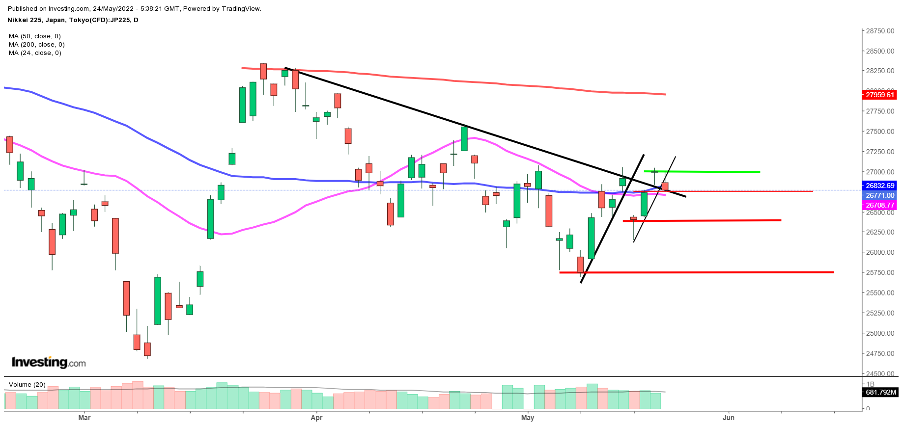 Ser BørsUdsigten på Nikkei225 minus 0,8 pct. (206 point) i 26.795 (handles fortsat), er der tale om en opbremsning efter bruddet af den tertiære toplinie i 26.900 niveauet. Ny toplinie i 27.000 niveauet. Ny tertiær bundlinie i 26.375 niveauet.