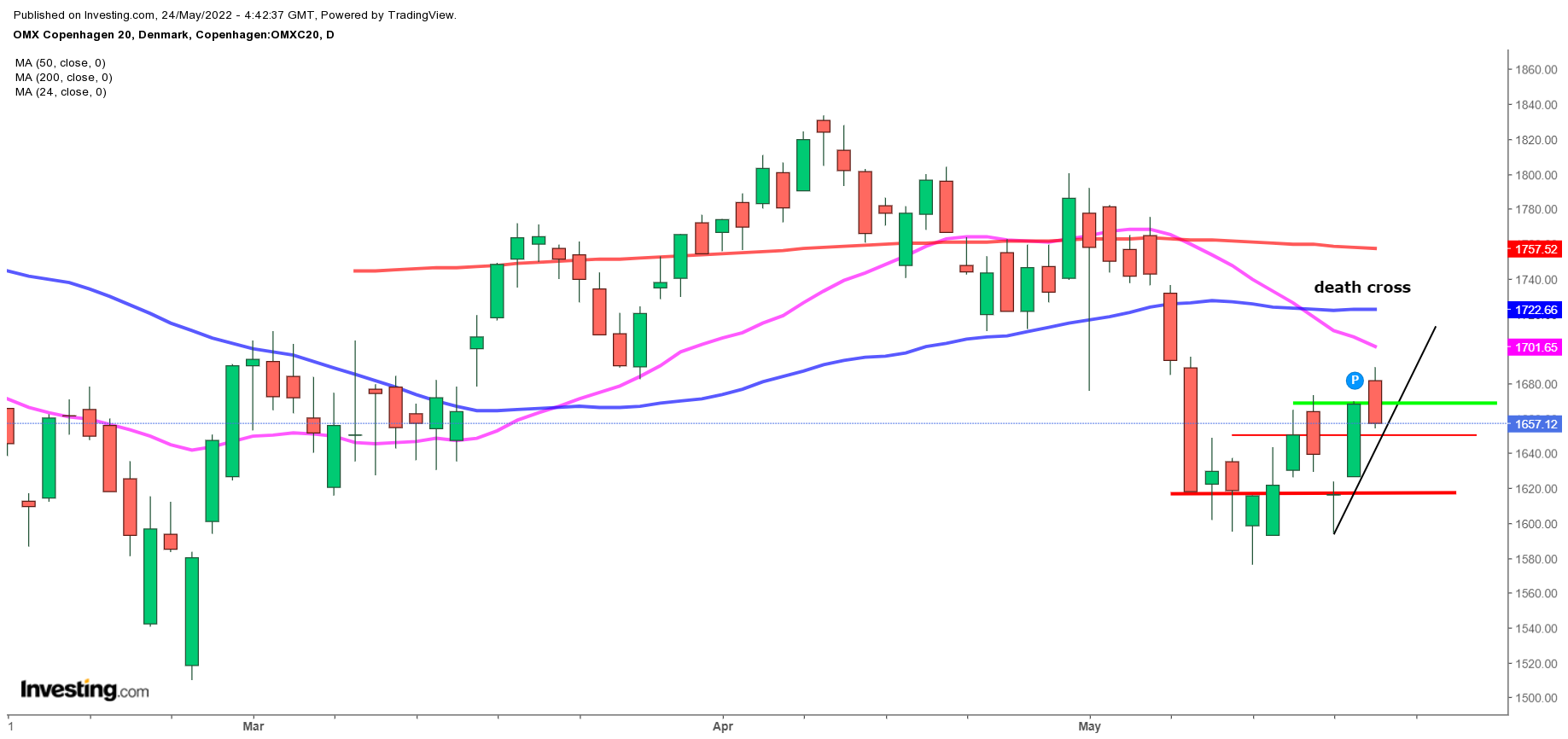 Ser BørsUdsigten på dagschartet for OMXC20 – minus 0,7 pct. (11 point) i indeks 1.657 – er der tale om et brud af toplinien i gættet konsolidering. Bundlinien i 1.618 niveauet er bekræftet, og brud heraf er et nyt EXIT-niveau.