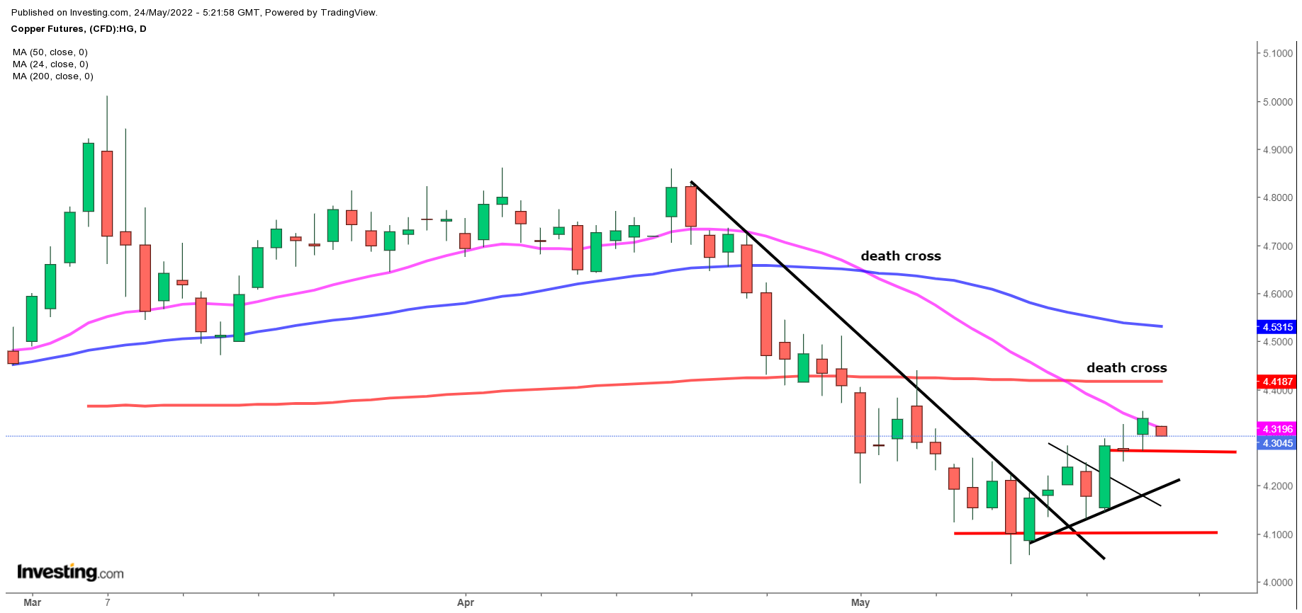 Ser BørsUdsigten på dagschartet for kobber (4,303 USD) til morgen, tirsdag, er der tale om et brud af en toplinie i 4,24 niveauet i en sidelæns trend, hvilket har udløst et købesignal.