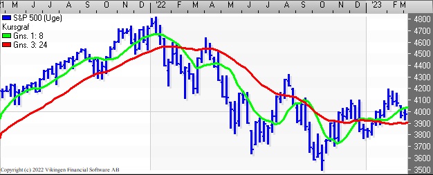 S&P 500 er i salg på dagsniveauet både for Bollingerkanalen og de glidende gennemsnit har etableret et Death Cross for 6 dage siden. Bollingerkanalen etablerede et salgssignal i midten af februar. På ugebasis er der fortsat købssignal i både Bollingerkanalen. De glidende gennemsnit etablerede et Golden Cross i december. Det lange glidende gennemsnit ligger i niveauet 3900 som en støttelinie.