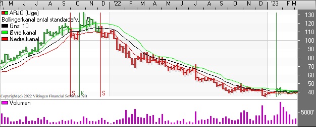Tirsdag var det Rockwool som var i fokus, da de bliver beskyldt for at have brudt sig mod EUs sanktioner. Rockwool afviser beskyldningerne, men usikkerheden sendte aktiekursen ned under 1600. På dagsniveauet er der salgssignal i både Bollingerkanalen og de glidende gennemsnit har etableret et Death Cross i midten af februar. På ugebasis har Bollingerkanalen netop etableret et salgssignal. Der er en faldende tendens i de tre indikationsmodeller på ugebasis. RSI har ramt 50. Afvent udviklingen.