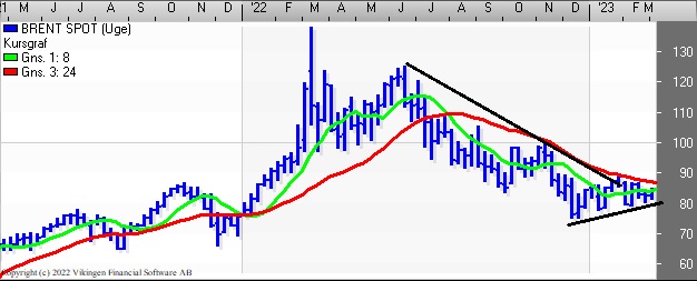 Brent Spot holder fast i tendensen med stigende bunde og faldende toppe. Der er divergens mellem de tre indikationsmodeller på ugebasis. RSI er i en faldende tendens og er under 50 på ugebasis. Momentum er i en stigende tendens og det har stået på siden månedsskiftet januar/februar. MACD er i en stigende tendens, men er fortsat under middelværdien. Nærmeste modstandsniveau er ved , mens støtteniveauet er ved 80.