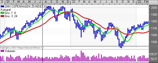 C25-indekset handles fortsat under niveauet 1.800. Den vandrette formation man har set i indekset betyder, at Bollingerkanalen på dagsniveauet er gået i salg. Det lange glidende gennemsnit ligger i niveauet 1770 som en støttelinie.