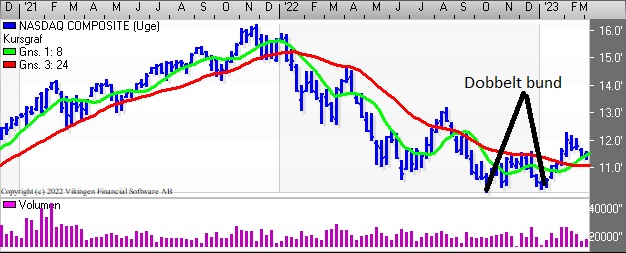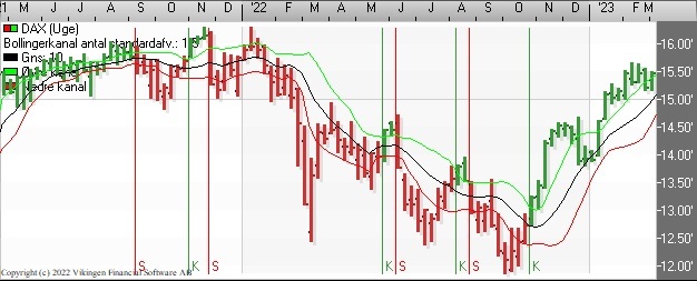 På ugebasis er der fortsat købssignal i Bollingerkanalen og de glidende gennemsnit på ugebasis. Det lange glidende gennemsnit ligger 14.250 som en støttelinie.